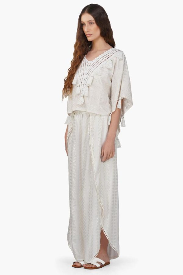 For added versatility and style, these pants feature a functional tie knot with tassel detail at the waist, allowing you to adjust the fit to your liking. Whether paired with a simple blouse for a casual daytime look or dressed up with a sequined top for a night out, the Golden Pearl Lurex Wrap Pants are sure to make a statement.