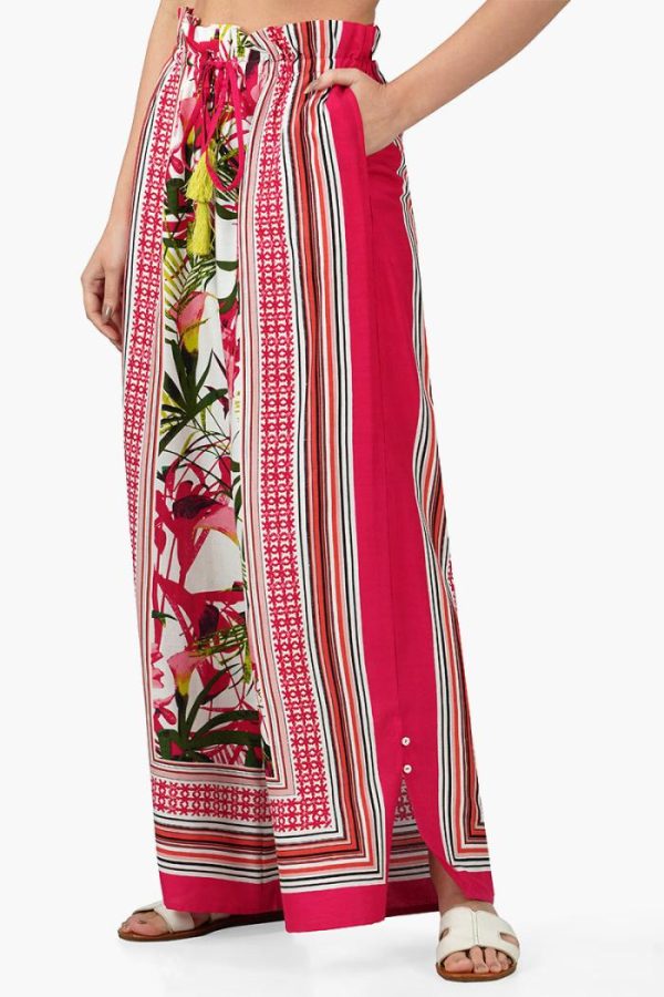 Treat yourself to these stunning Paradise Floral Printed Pants. The wide leg silhouette and elastic waistband with ruffle details make these pants the perfect choice for day-to-night wear. The drawstring tie with tassels and two side slit buttons add a stylish touch. Two pockets on the sides provide the perfect place to keep your essentials. The floral and stripes printed pattern give these pants a unique look that will draw attention. Perfect for the beach or a stroll around town, these pants will be your favourite companion this season.