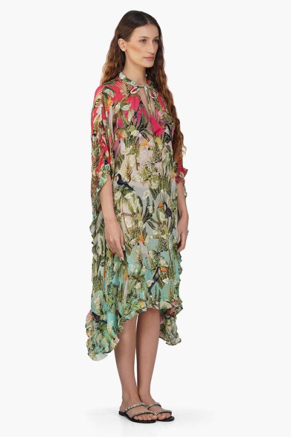 Introducing our Farm Chirping Birds Printed Frill Kaftan – the epitome of laid-back elegance and summer sophistication.