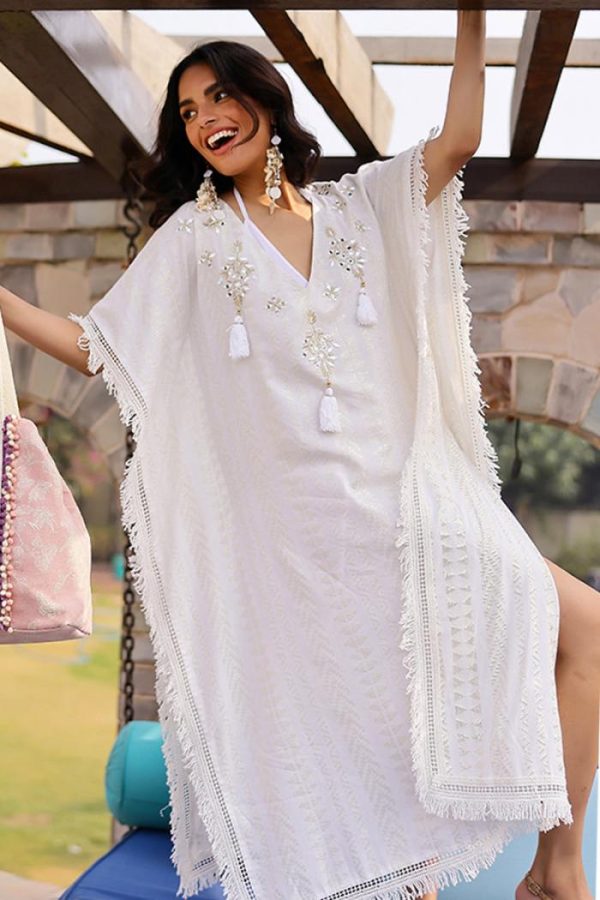Perfect for lounging poolside, attending a beachside soirée, or simply indulging in luxurious relaxation, the Golden Pearl Lurex Tassel Kaftan is sure to make a statement. Embrace its shimmering allure and let your style shine bright all season long. With its exquisite detailing and effortless silhouette, this kaftan dress is the epitome of tropical glamour.