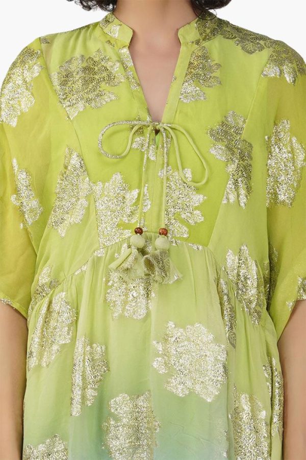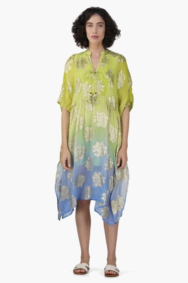 Made from a blend of viscose and lurex, the kaftan features a stunning parrot green to sea blue ombre design with metallic foil imprinted motifs that shimmer in the light. The drawstring neckline and relaxed fit make it a breeze to wear, whether you’re lounging by the pool or exploring new adventures.