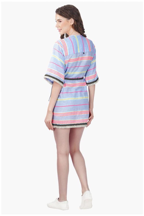 The Samantha Striped Lace Kimono with self-ties is the perfect Kimono for any special occasion. Its wrap silhouette is both comfortable and flattering, while the above the knee length ensures you look your comfortable best. The self-tie closure and kimono sleeves give it a unique and stylish look. The fringe and lace detailing at the hemline and sleeves adds a touch of femininity to the dress. The surplice neckline is both classic and modern, while the front pocket adds a practical element. Whether you’re attending a special event or just running errands, this Kimono is sure to make a statement.