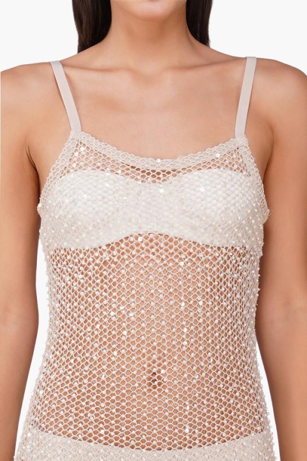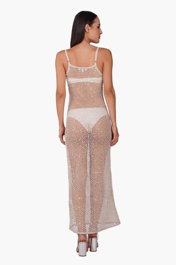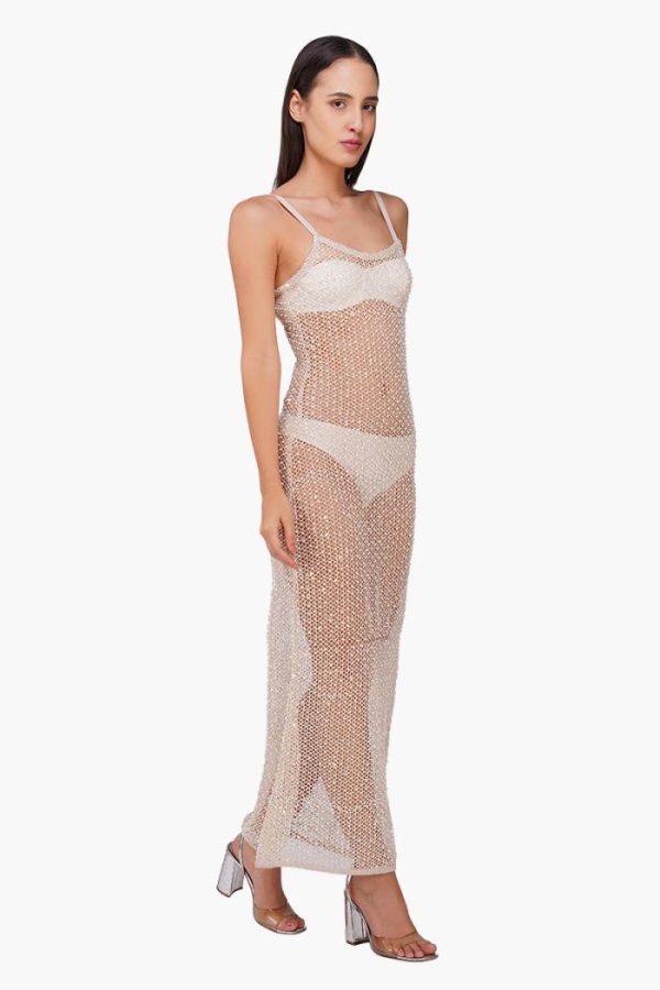 - Long dress crafted from cotton crochet loose-weave pearl fabric