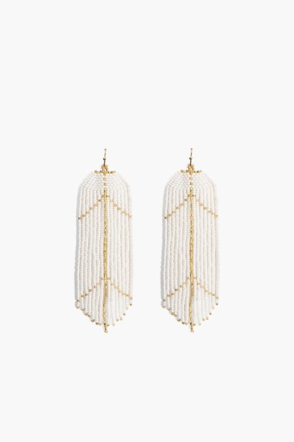 A waterfall of stunning white beads comes together with gold accents to make a fluid feather that hangs from your ears, creating a tranquil statement.