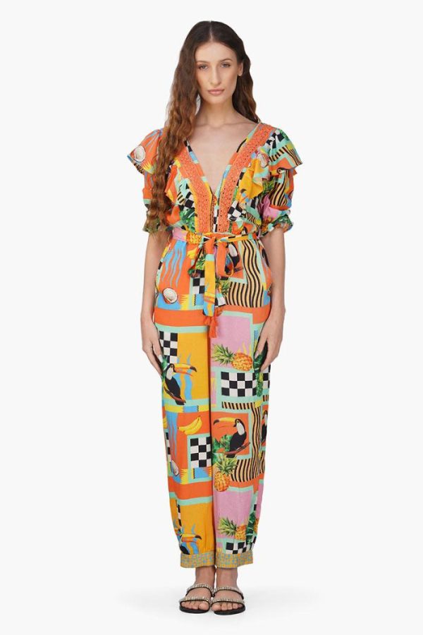 The Barbara Printed Lace Jumpsuit is a captivating blend of vibrant prints and feminine details. This multicolor jumpsuit exudes charm and elegance with its eye-catching design and intricate lace accents.