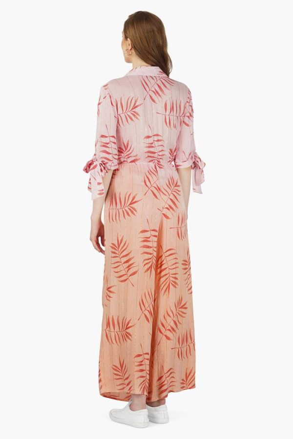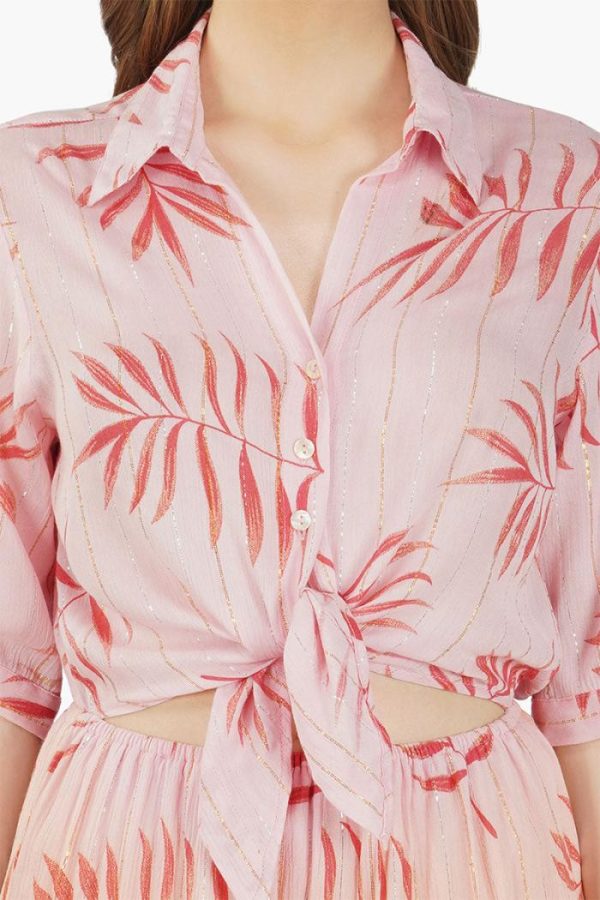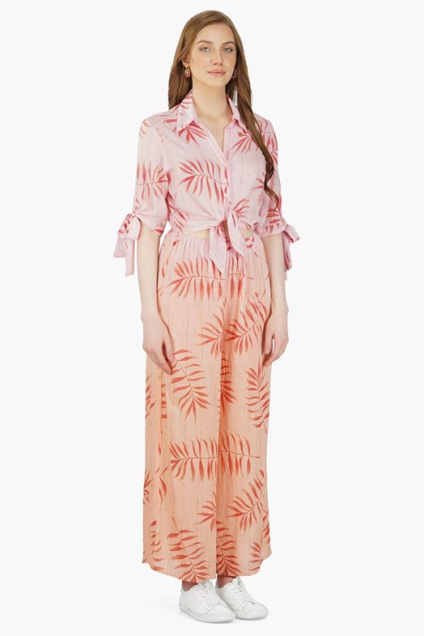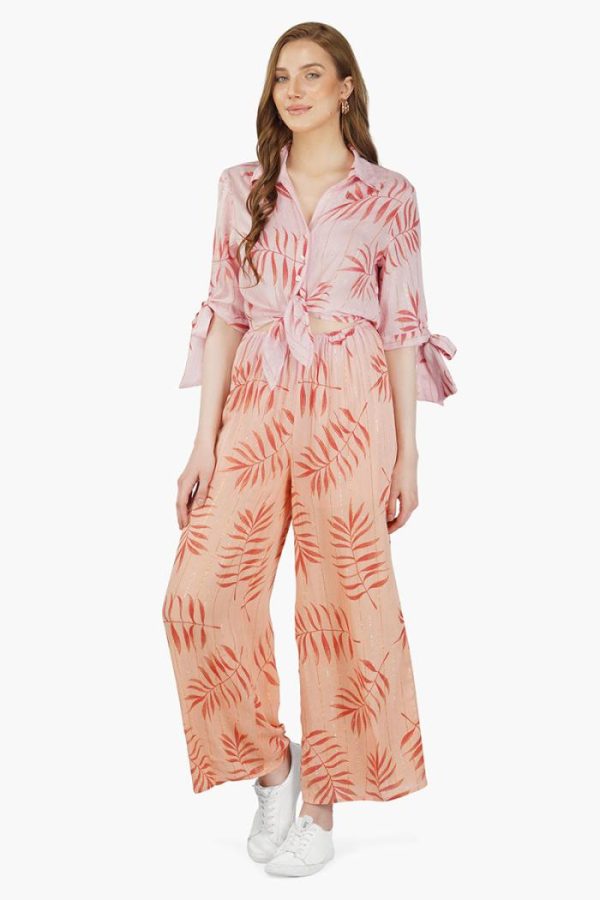 Introducing the Dream Arecale Jumpsuit, a chic and trendy outfit that effortlessly combines style and comfort. This collared jumpsuit features a button-down top with a tie-up detail, adding a touch of sophistication to the design. The elbow-length sleeves with tie-ups create a playful and fashionable look. The cutout front adds a subtle hint of allure. With its elastic waist, this jumpsuit offers a flattering fit for all body types. The wide-legged silhouette brings a sense of elegance and movement to your ensemble. The lurex metallic lines with an all-over contrasting leaf print add a touch o