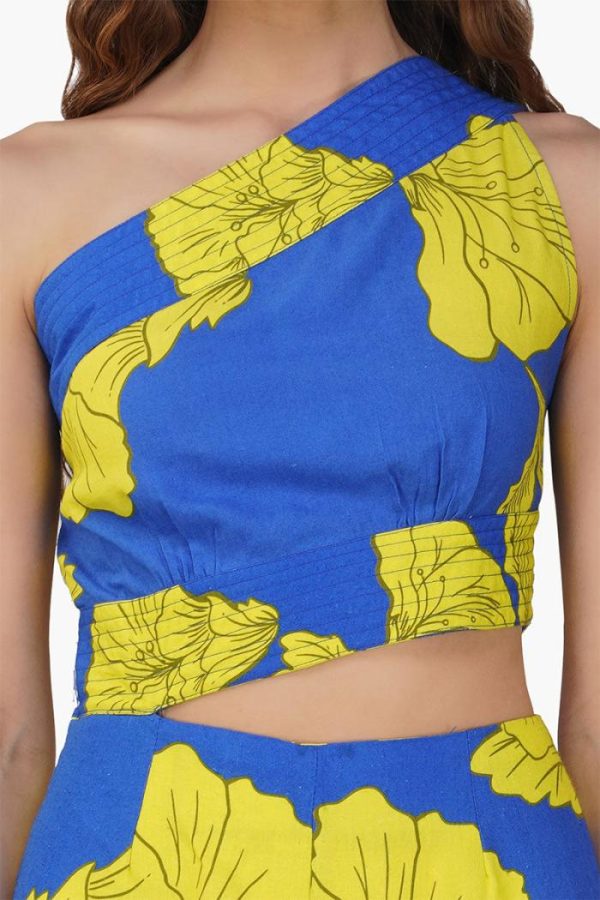 The one-shoulder design adds a contemporary twist to the jumpsuit, while the thread detailed panel at the upper body and bodice edge adds texture and visual interest to the garment. Slight gathers at the bodice edge create a flattering silhouette, accentuating your figure and adding a feminine touch to the overall look.