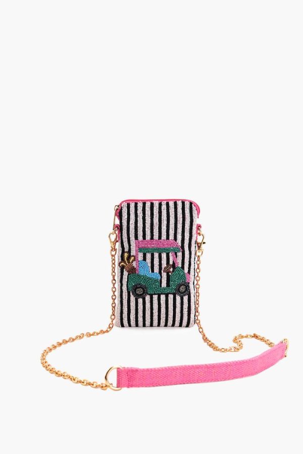 This compact vertical crossbody bag is your new go-to for sporty days and fun statement looks. With bold black and pink stripes and a cheerful, hand-beaded golf cart design, it’s the perfect mix of playful and polished. Crafted with rich texture and charm, it features a gold chain strap paired with a soft pink durrie shoulder pad for comfy wear—and a matching pink durrie panel at the back for extra style points. It fits your phone, cards, and keys with ease, making it functional and fabulous. Finished with a secure top zip closure and green poly lining, it’s ready to tag along to golf tournaments, brunches, or anytime you want your accessories to do the talking.