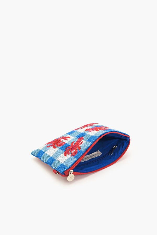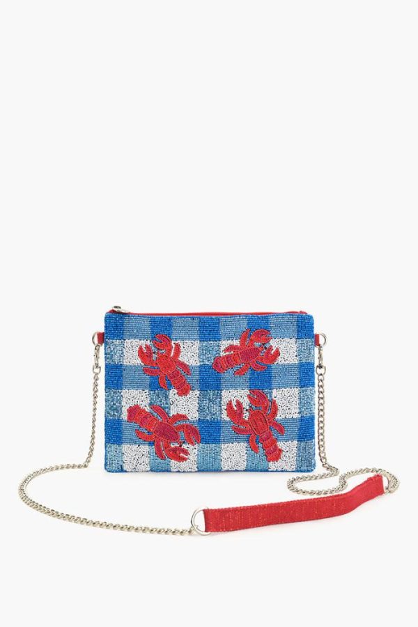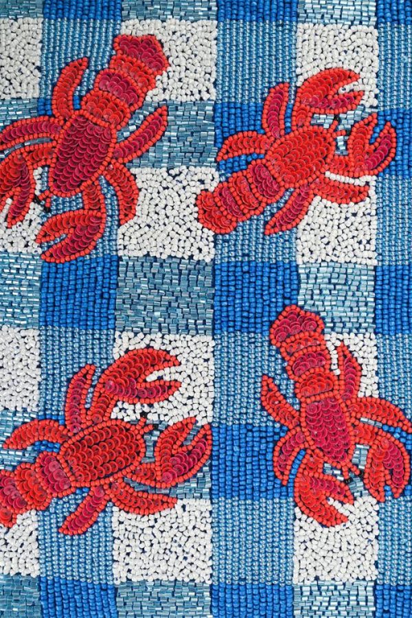 This small sling bag is all about making waves with its playful red lobster and blue gingham pattern on the front.