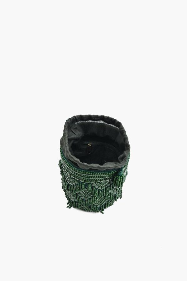 Turn heads with this beautifully beaded bucket bag, adorned with stunning emerald stones and intricate beadwork. The drawstring closure, complete with tassel details, adds a playful touch, while the lined interiors feature a zip pocket to keep your essentials secure. Perfectly sized at 10″ x 8″ x 6″, this bag is the ideal blend of style and function.