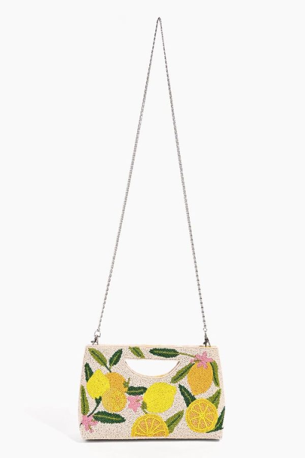 The Make Lemonade Clutch is a burst of citrusy charm in a compact and stylish package. This clutch is a zesty celebration, fully adorned with hand-beaded lemons on both the front and back, making it a delightful accessory that’s as refreshing as it is chic. Carry your clutch with grace and ease using the long chain strap. The silver-toned chain adds a touch of elegance, allowing you to sling it over your shoulder or across your body for a versatile look.