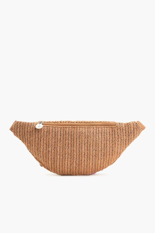 - This trendy belt bag is crafted from brown raffia and features a front embellished with a charming shells and starfish pattern, adding a coastal vibe to your style