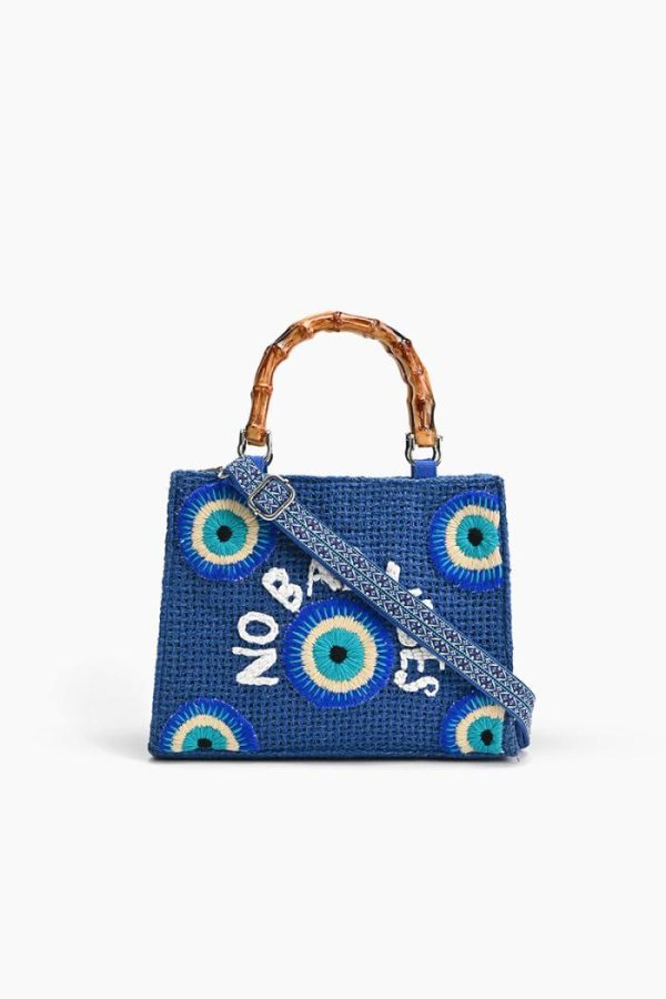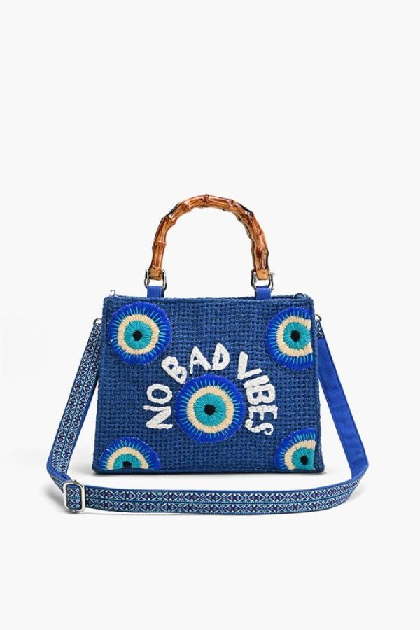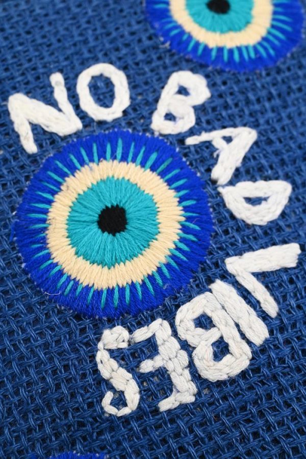 Elevate your look with embellishments featuring “”no bad vibes”” and evil eye motifs on the front, exuding an aura of mystique and protection. Made in cotton jacquard with a hint of gold lurex, this tote epitomizes luxury and refinement, making it a versatile accessory for all occasions.