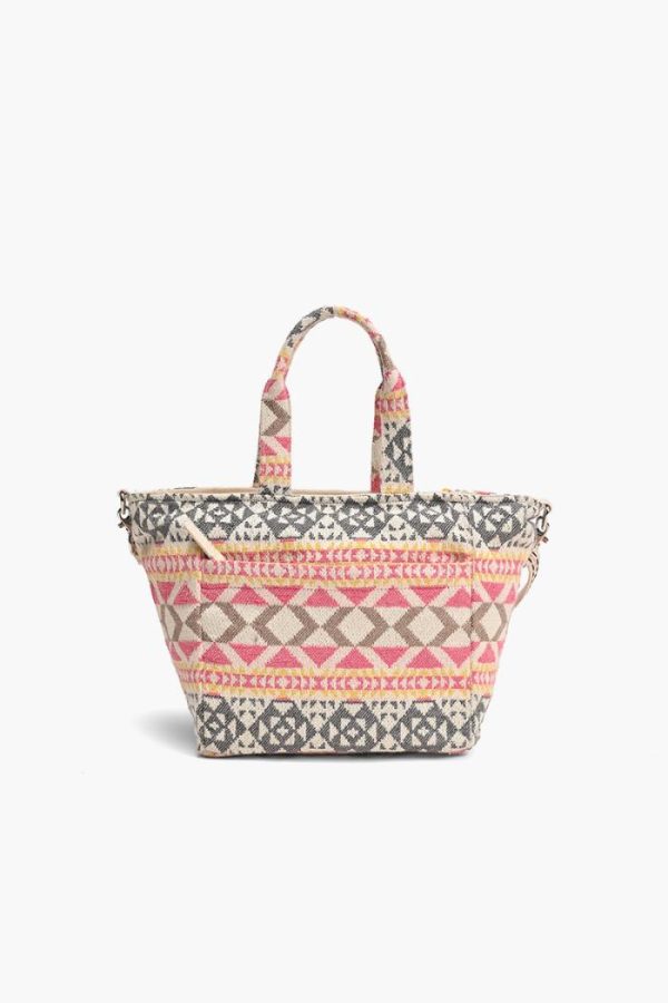The pink camo mini tote is a stylish and functional bag that is perfect for a day out. It features hand-held straps and an embellished front in a camo pattern with pompom lace detail for a touch of femininity. The straps also feature embroidered lace detail for an extra stylish touch. It also has a long adjustable crossbody strap for comfortable wear and a top zip closure to keep your items secure. It is made in hand-woven jacquard with lined interiors and a zip pocket and a mobile pocket for convenience. This tote is perfect for a day out and will add a stylish touch to any outfit. Carry it with a classic dress, handbeaded jewels and sunnies for a vintage girl look.