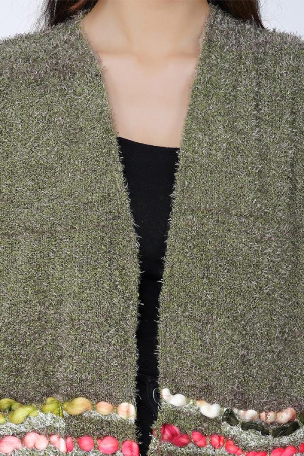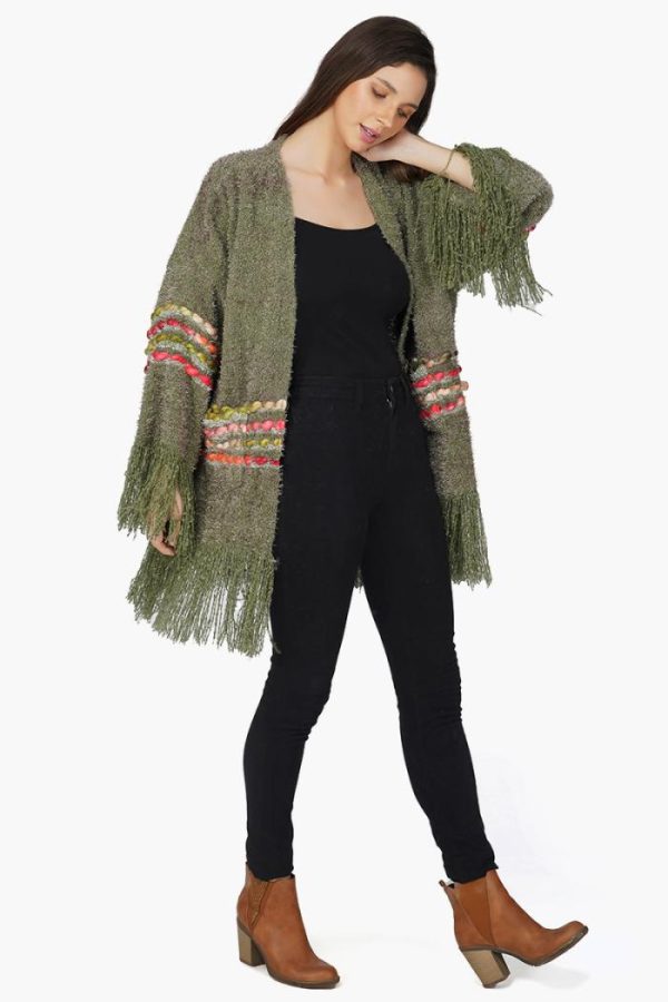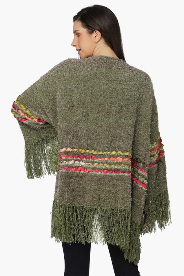 - The cardigan features multi-colored stripes at the bottom and sleeve hem with a kimono style cut and fringed edges.