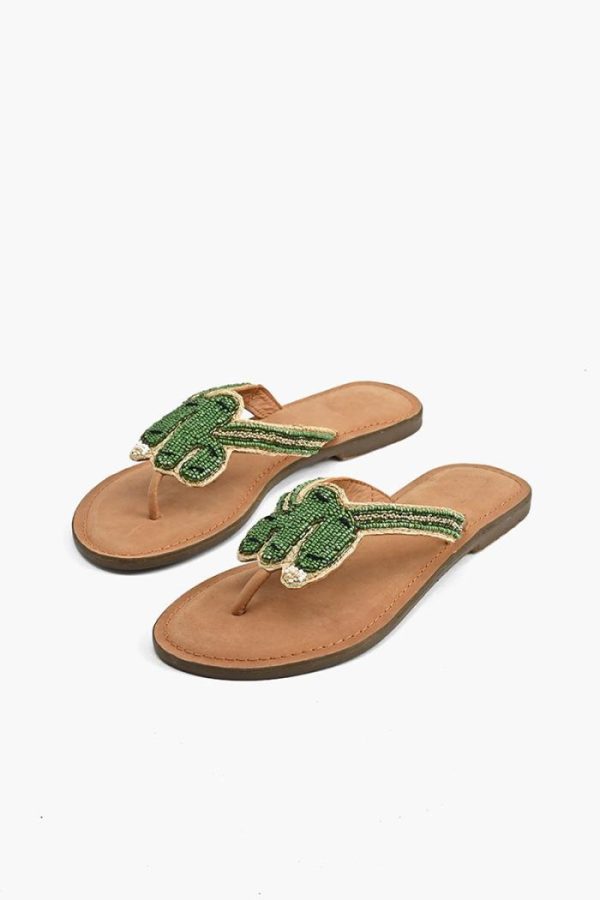 Own your quirkiness with our cactus beaded slider sandals! Made with pure leather and shimmering green beadwork, these fun T-strap slip-ons are super comfortable. Slide ’em on and get ready to play.