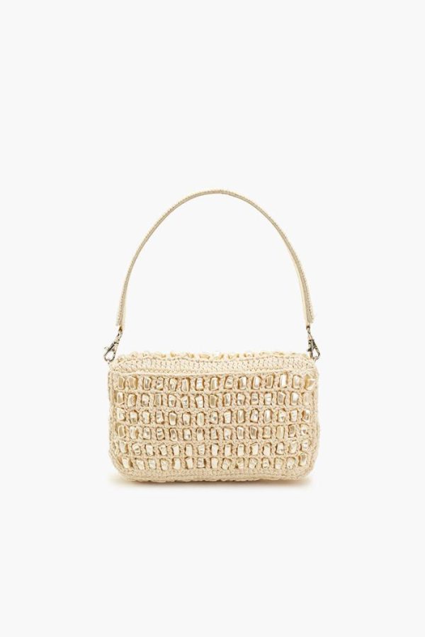 This crocheted ivory shoulder bag is a chic mix of natural craftsmanship and modern functionality. Its shell-inspired crochet design gives it a coastal charm, while the flap closure with dual magnetic snaps keeps your essentials secure. The interior is fully lined with natural satin and features a zipper pocket for organized storage. A handy back open pocket adds quick access to items you need on the go.