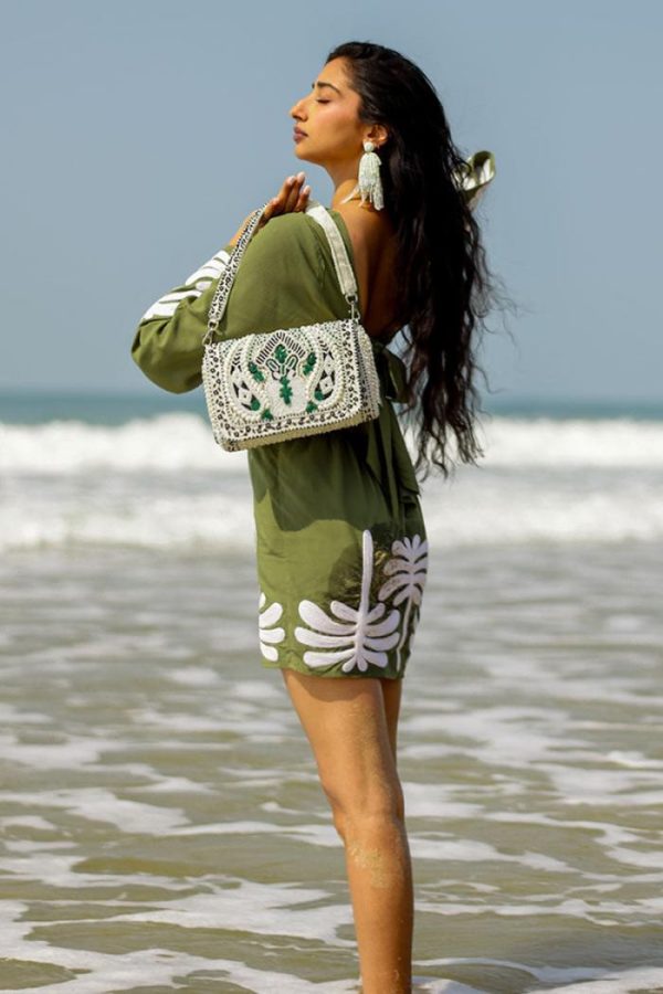 The front of this bag is a true work of art, with emerald green, black and white pearl detailing coming together in a beautifully intricate pattern.
