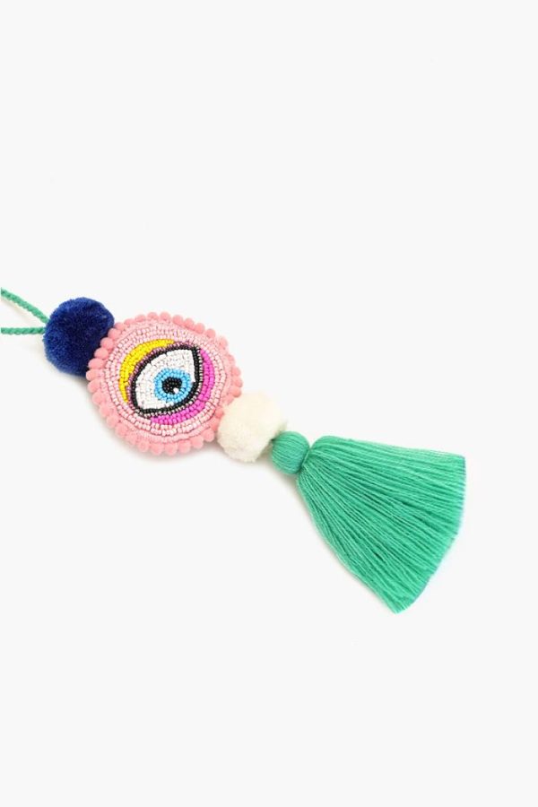 - This bright-colored round tassel is beautifully embellished with an eye-catching evil eye pattern on both the front and back, adding a protective and stylish touch.