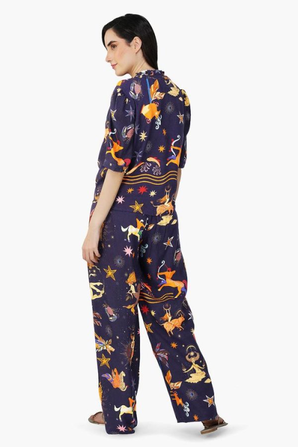 Make a statement with this Printed Shirt, featuring an enchanting celestial print all over. The ruffles around the neck add a feminine touch, while the hidden button-down placket with beaded buttons offers subtle elegance. With loose half sleeves and cuffs, this shirt combines comfort with chic style. Perfect for elevating your everyday look.