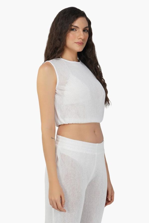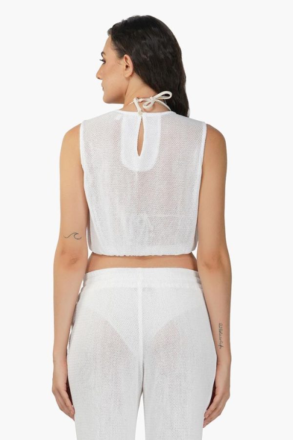 Our White Indy Mesh Crop Top is a stylish and airy beach cover-up crafted with a blend of cotton net crochet and modern design elements. This crop top has an elasticated hem for comfort and a zero-round neck with broad shoulders for a contemporary look. It comes with a back keyhole with a button loop closure for a touch of sophistication.