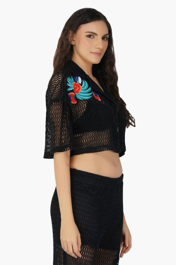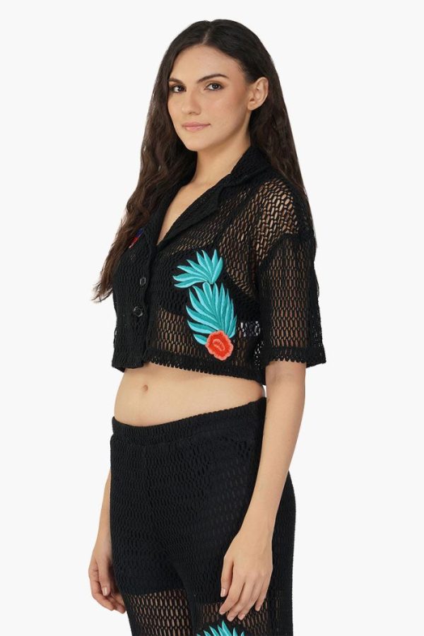 This cropped half-sleeve stunner is crafted from 100% cotton and showcases an intricate black crochet net design that’s nothing short of mesmerizing. The vibrant blue floral embroidery, complete with whimsical butterflies, adds a pop of color and playfulness, making it a must-have for any summer wardrobe. The lapel collar and button-down bodice offer a relaxed, effortless fit that’s both comfortable and undeniably chic.