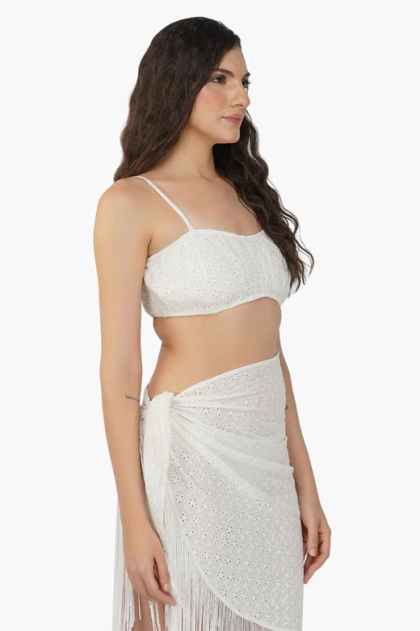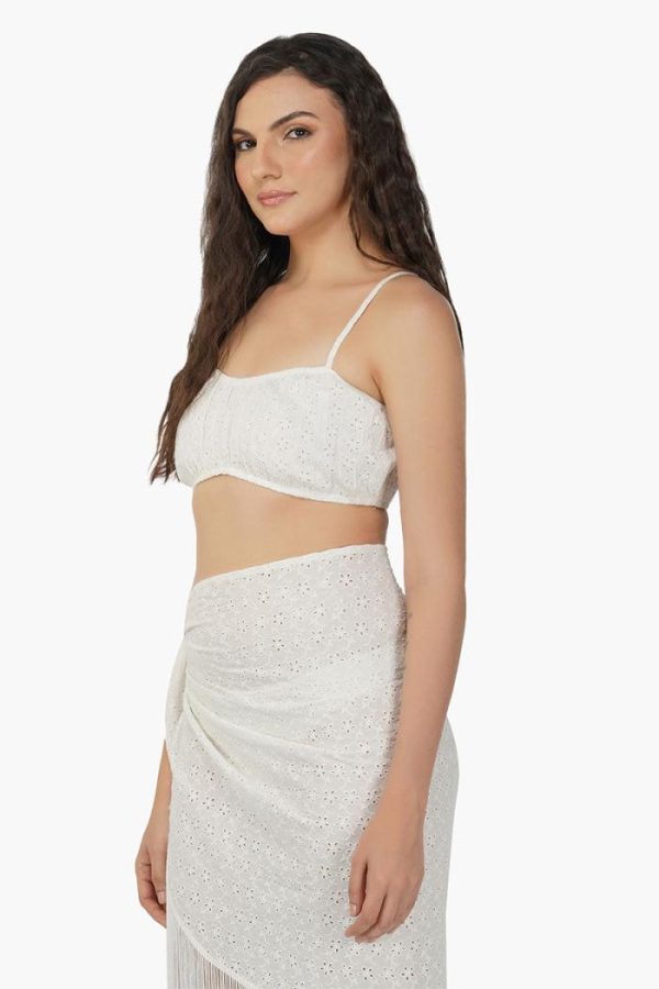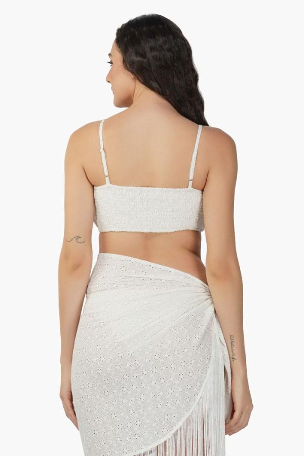 The Pollo Crop Top – a stylish and trendy piece that combines the charm of schiffli in pristine white cotton. This crop top has a gathered bodice that is fully lined with cotton, straps with ring adjusters for a customizable fit, and back smocking for a comfortable and flattering fit.