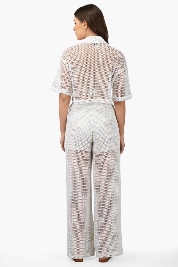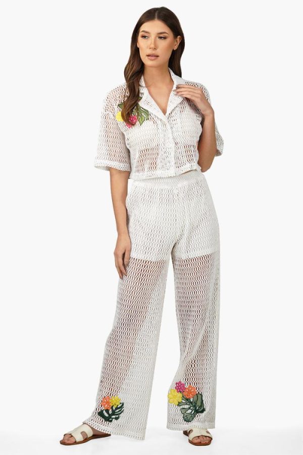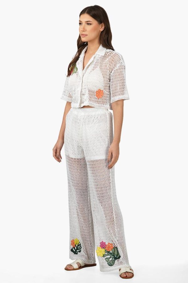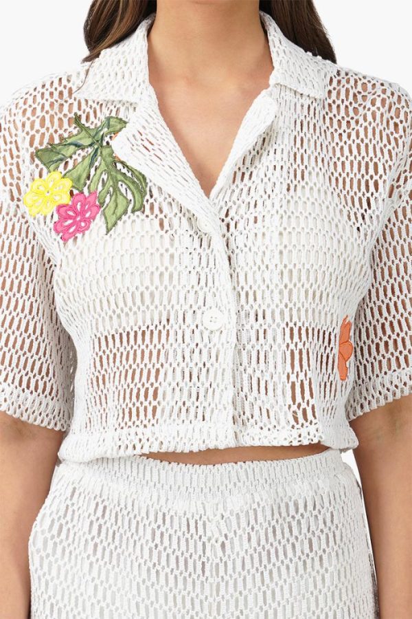 Make a statement in this Siera Crochet Cropped Shirt with Floral Embroidery. This top is perfect for the girl who wants to make a statement without having to shout. The delicate crochet fabric is accented with beautiful hand embroidered flowers that add a touch of femininity. It has a relaxed fit with drop shoulders and a half sleeve. The cropped length gives it a modern style that looks great with high-waisted jeans or shorts. For a stylish and unique look, add this top to your wardrobe today. Pairs well with the matching crochet pants.